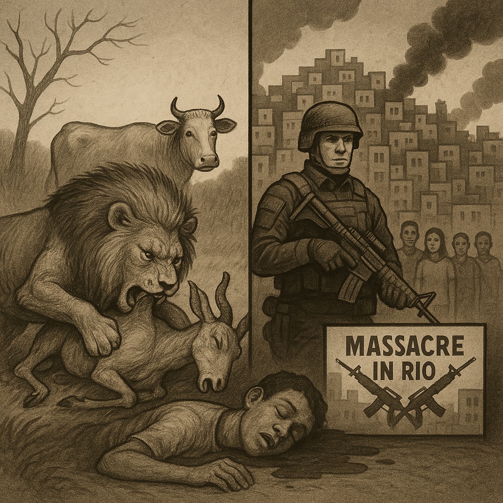 A natureza é marcada pela aleatoriedade e pela indiferença, condenando os animais ao presente. A política, ensinava Aristóteles, permitiu ao ser humano superar esse destino biológico e criar hierarquias de valores. Hoje, porém, a civilização revela sua falha quando a política transforma a violência em técnica e objetivo. Achille Mbembe chamou isso de necropolítica: o poder de decidir quem vive e quem morre, instaurando mundos de medo e “mortos-vivos”. No Brasil, sua lógica se mostra nas operações policiais, na exibição pública de armas e cadáveres, e na produção cotidiana do medo.
